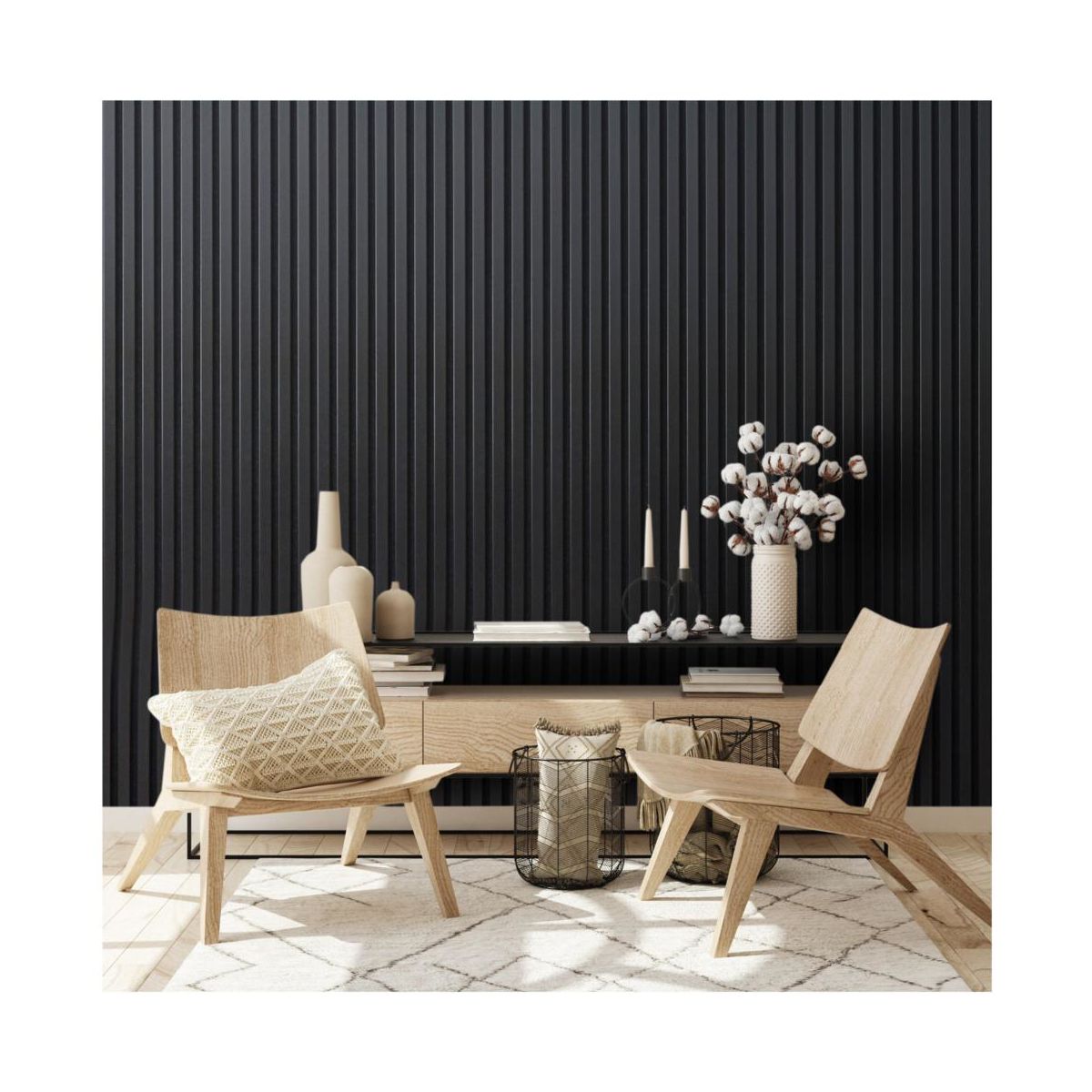 Ljudabsorberande väggpaneler i trä som passar perfekt i den nordiska inredningsstilen. Produkten består av mörka träribbor tillverkade av äkta träfaner, samt en bakomliggande akustikfilt. Dessa paneler har en hög ljudabsorptionskoefficient och filtunderlaget är gjort av 80 % återvunnen polyester (PET).