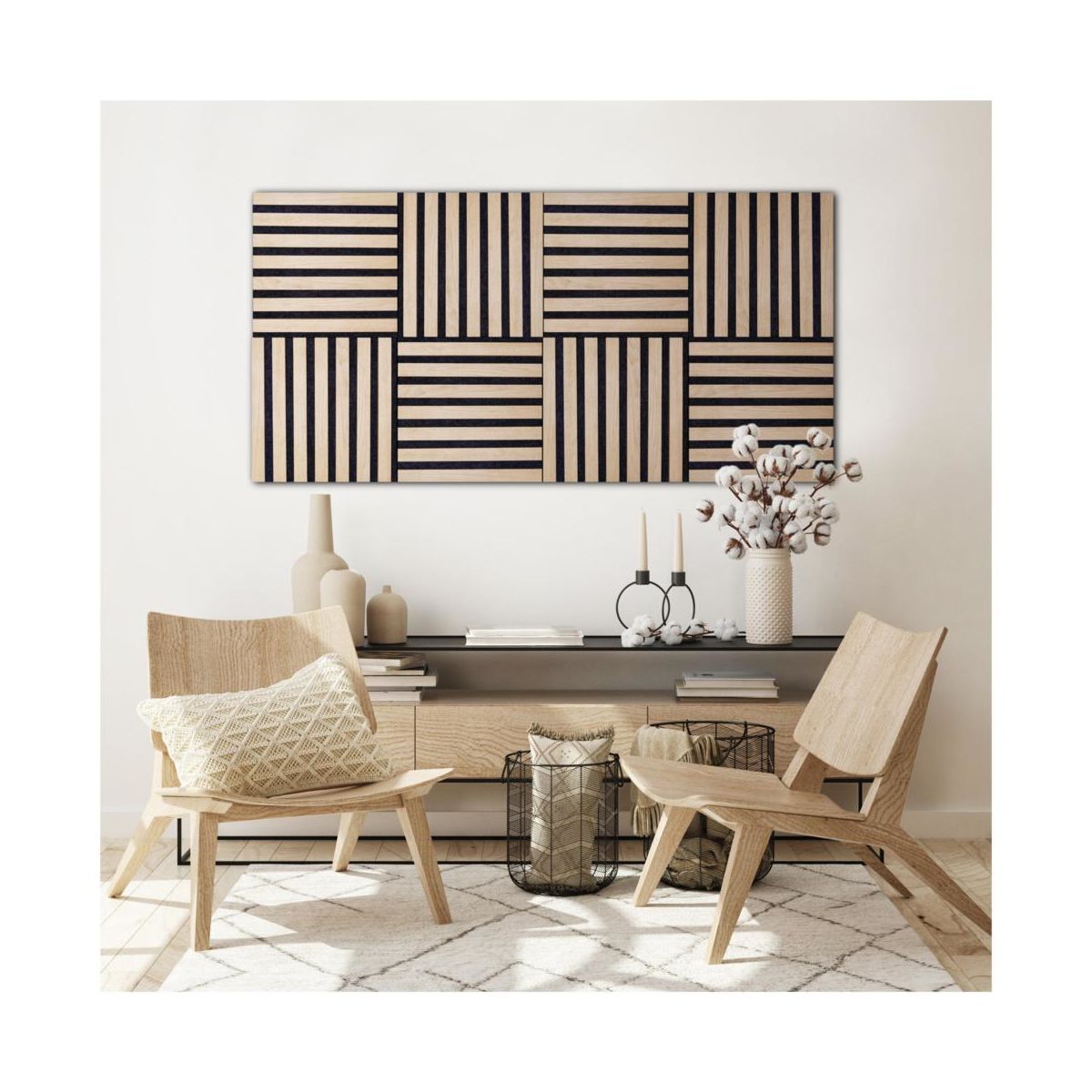 Ljudabsorberande väggpaneler i trä som passar perfekt i den nordiska inredningsstilen. Produkten består av bruna träribbor tillverkade av äkta träfaner, samt en bakomliggande akustikfilt. Dessa paneler har en hög ljudabsorptionskoefficient och filtunderlaget är gjort av 80 % återvunnen polyester (PET).