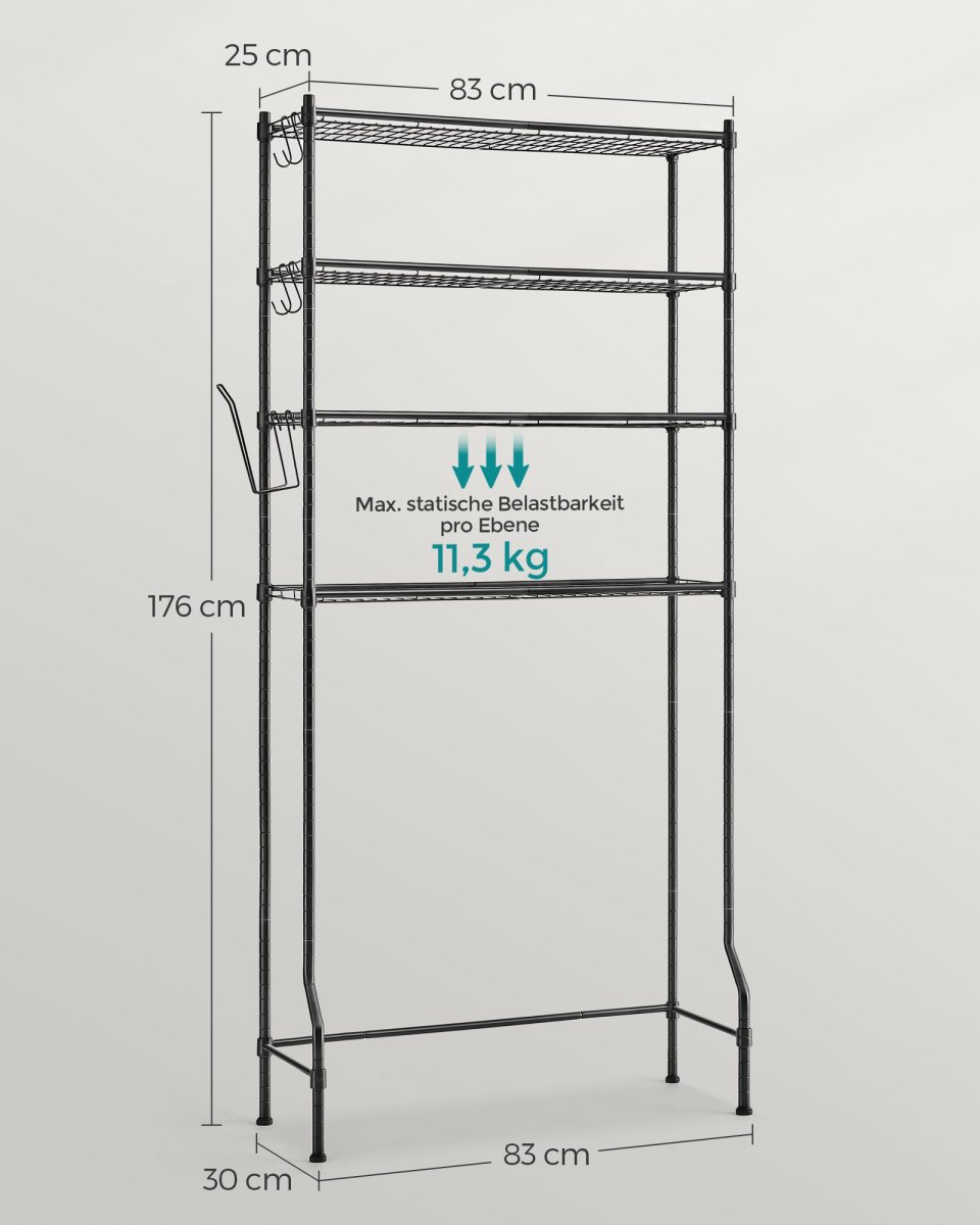 Badrumshylla över toalett/tvättmaskin med 4 hyllor – svart metall