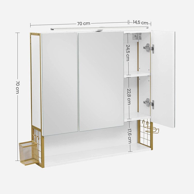Badrumsspegelskåp i vitguld med LED-belysning, 70 × 14,5 × 70 cm