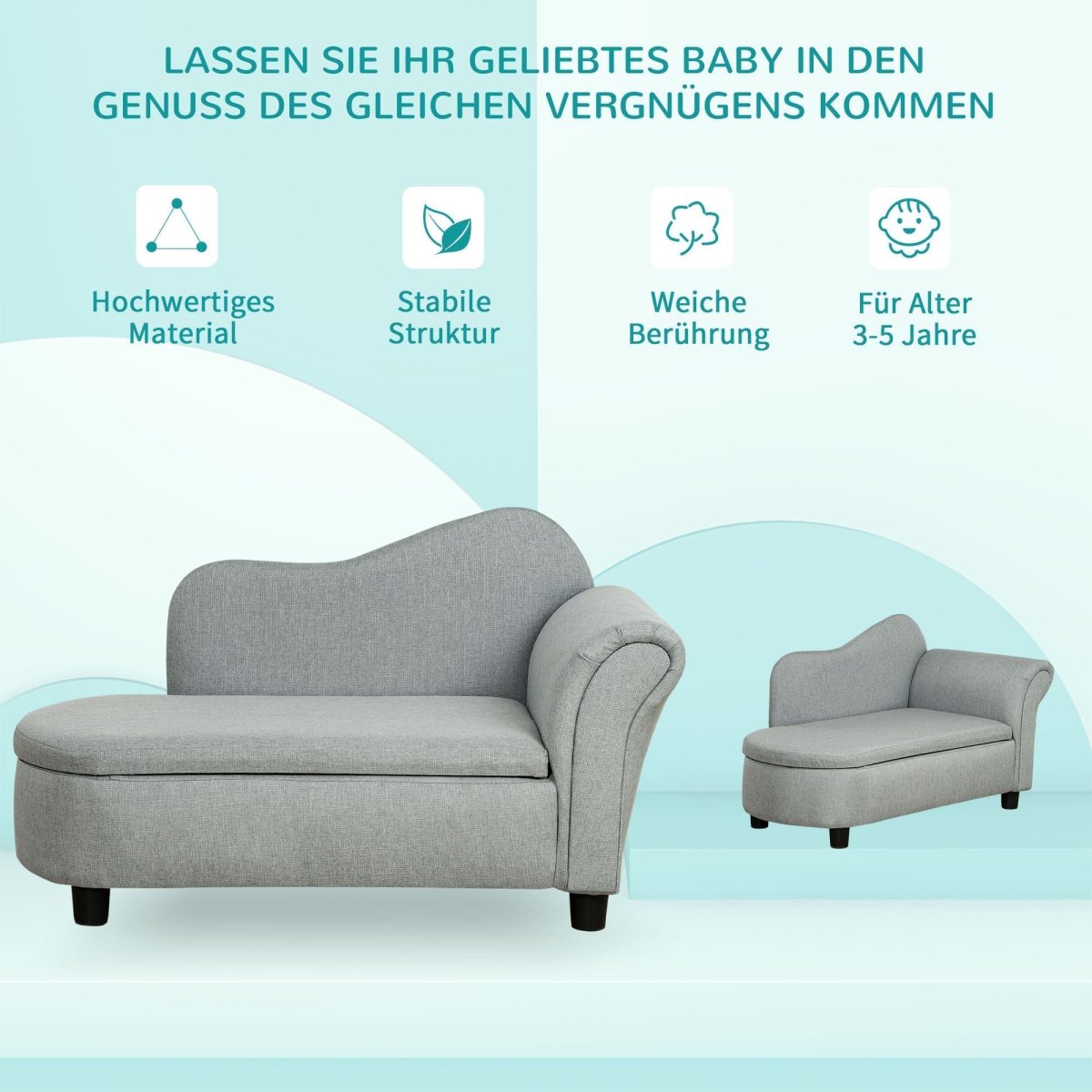 Barnvänlig halvsoffa med förvaring för åldrarna 1,5-3 år Stabil konstruktion i eukalyptusträ och linnelook Bekväm och rymlig med generös stoppning, högt ryggstöd och armstöd Praktiskt dolt förvaringsutrymme under sitsen Mått: 80 x 40 x 49 cm, maxvikt 45 kg, enkel att montera