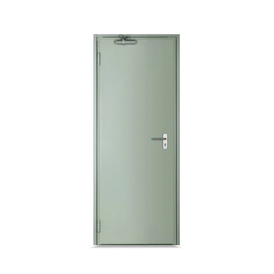 Dörrblad: Tillverkat av galvaniserad stålplåt 0,7 mm, på båda sidor Färg: RAL 7038 ljusgrå 3-sidig fals för bättre tätning 2 tre-delade gångjärn per dörrblad, DIN-godkända – ett med fjäder för halvautomatisk stängning Ståltapp 14×36 mm – skydd mot uppbrytning Mineralullisolering ROCKWOOL eller SAINT GOBAIN, densitet 145 kg/m³ Infälld låskista CF med dubbel gipsplatta förstärkning (glasfiber) Antiknäpphandtag enligt DIN 18273, tillverkat av brandresistent polyamid med stålsprint, svart färg Cylindertyp 40×40, levereras med 3 nycklar Tjocklek dörrblad: 51 mm Utförande: Vänster eller Högerhängd