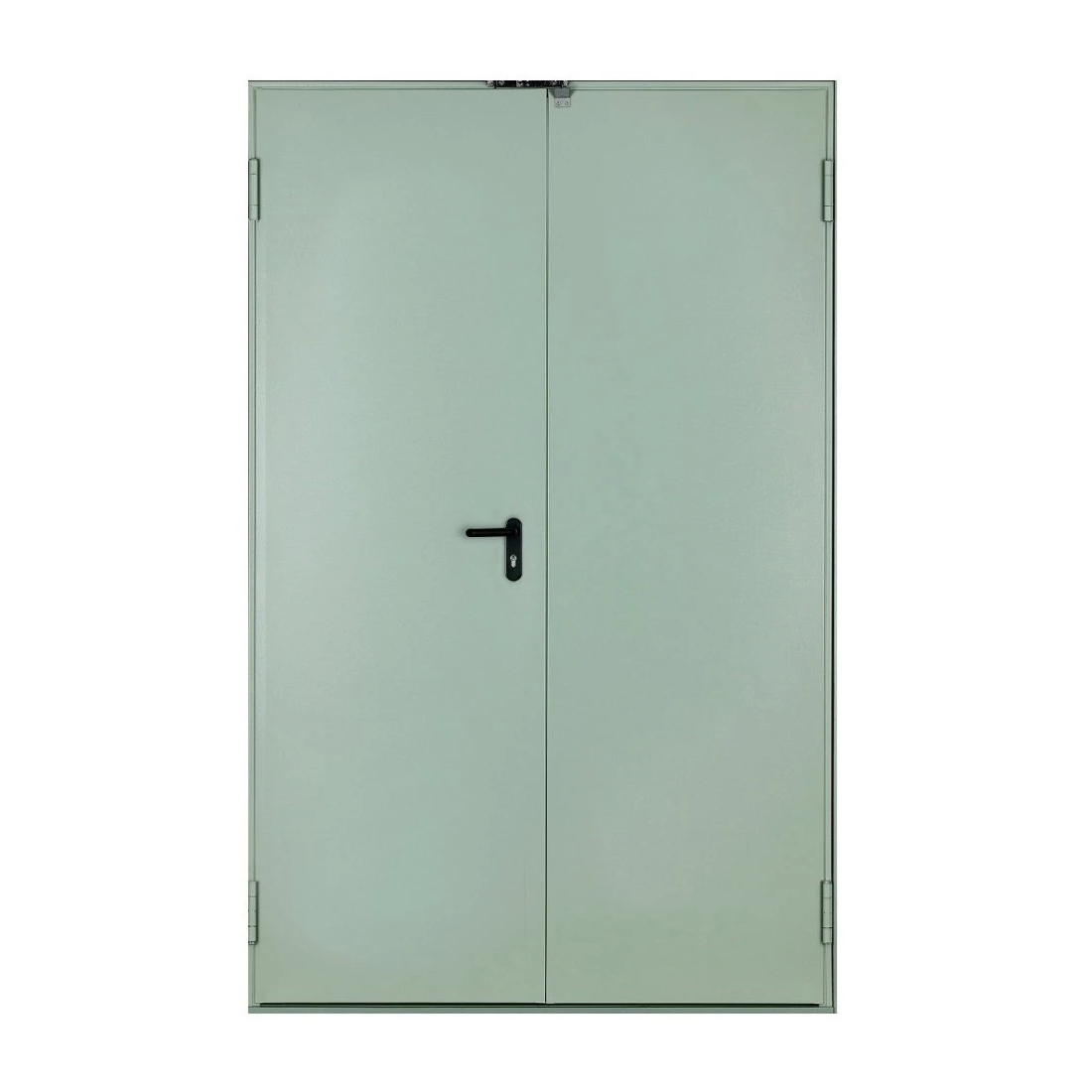 Dörrblad: Tillverkat av galvaniserad stålplåt 0,7 mm, på båda sidor Färg: RAL 7038 ljusgrå 3-sidig fals för bättre tätning 2 tre-delade gångjärn per dörrblad, DIN-godkända – ett med fjäder för halvautomatisk stängning Ståltapp 14×36 mm – skydd mot uppbrytning Mineralullisolering ROCKWOOL eller SAINT GOBAIN, densitet 145 kg/m³ Infälld låskista CF med dubbel gipsplatta förstärkning (glasfiber) Antiknäpphandtag enligt DIN 18273, tillverkat av brandresistent polyamid med stålsprint, svart färg Cylindertyp 40×40, levereras med 3 nycklar Tjocklek dörrblad: 51 mm Indelning av vingarna: 930 mm + resten Utförande: Vänster eller Högerhängd