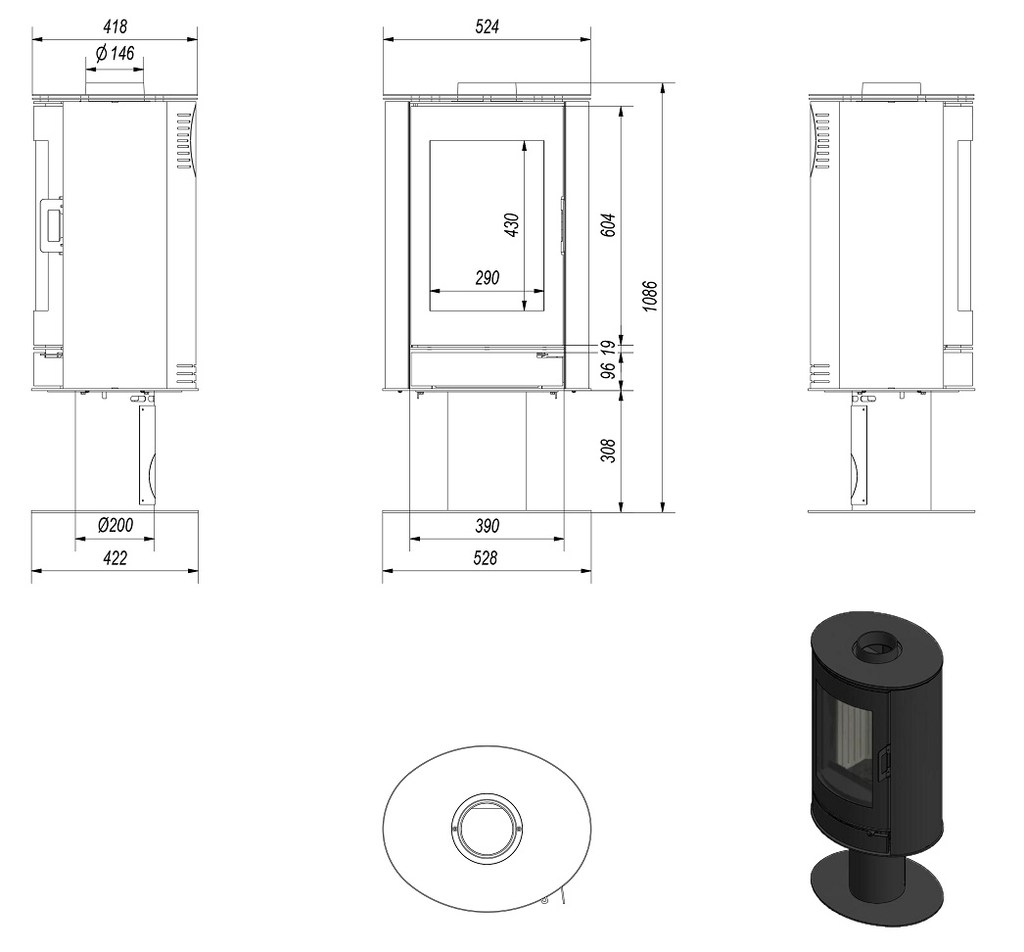 Braskamin på pelare i modern design med ett stort och fint frontglas och två sidoglas för perfekt insyn till lågorna.Braskaminens eldstad är klädd med vermeculit och är utrustad med skakroster och asklåda. Luckans tjocklek är av stål på 5 mm. Handtagen är kromade, vilket är en slitstark ytbehandling som minskar risken för slitage. I vedfacket finns uttag för uteluftsanslutning neråt eller bakåt.