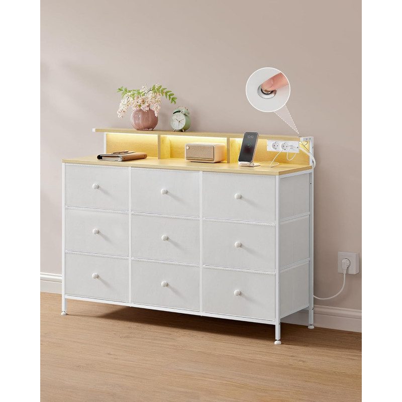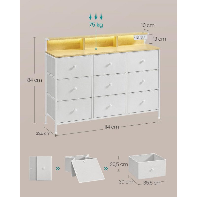Justerbar LED-belysning med inbyggda laddningsportar för extra bekvämlighet Utrustad med 2 AC-uttag och 2 USB-portar för enkel laddning av mobil och tillbehör Rymlig och smart förvaring med 9 tyglådor, öppna fack och en upphöjd hylla Perfekt för att hålla ordning på allt från kläder till småprylar och dekorationer Robust och stabil konstruktion med stålram, slitstarka material och justerbara fötter Tipsskydd hjälper till att öka säkerheten och stabiliteten Mångsidig design som passar lika bra i sovrum, vardagsrum som i hall Enkel montering med tydliga instruktioner och märkta delar för smidig uppsättning