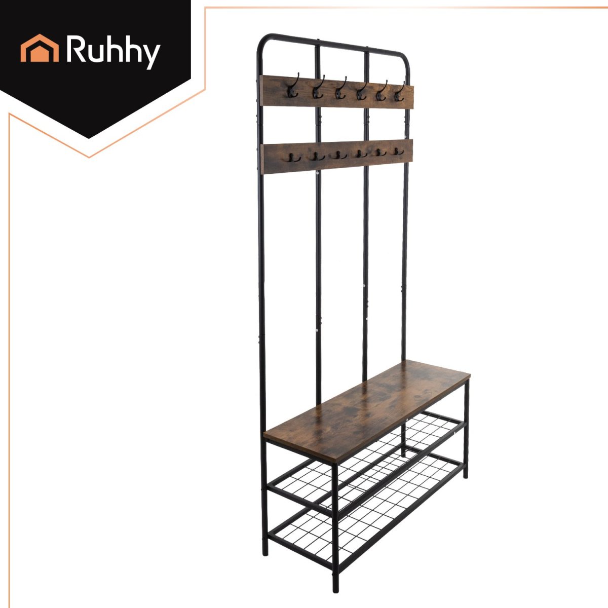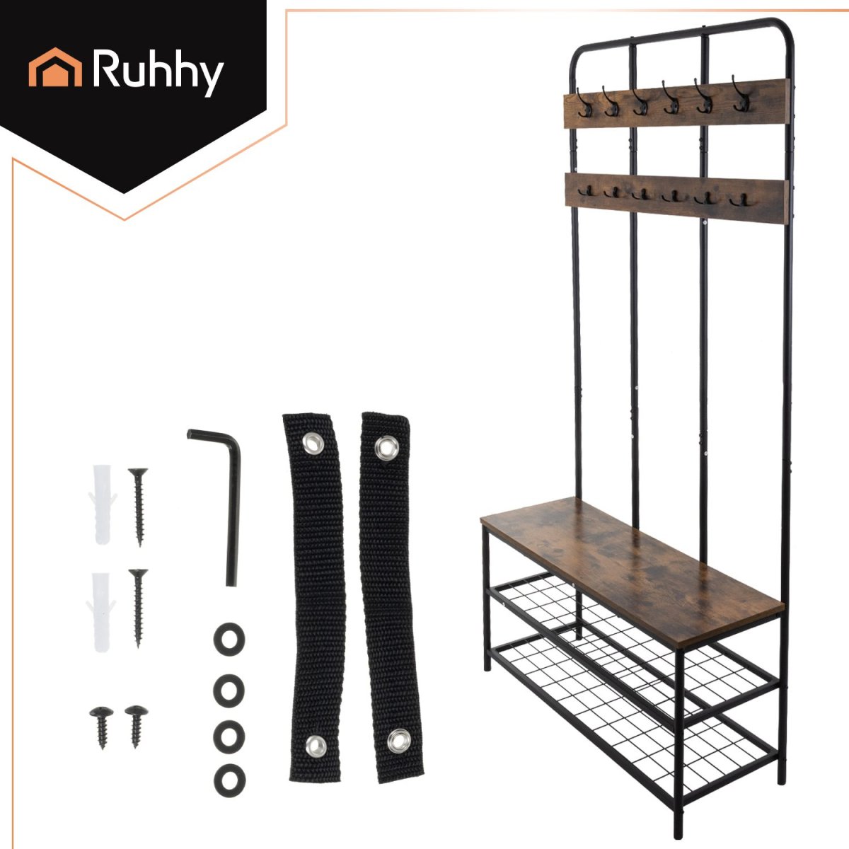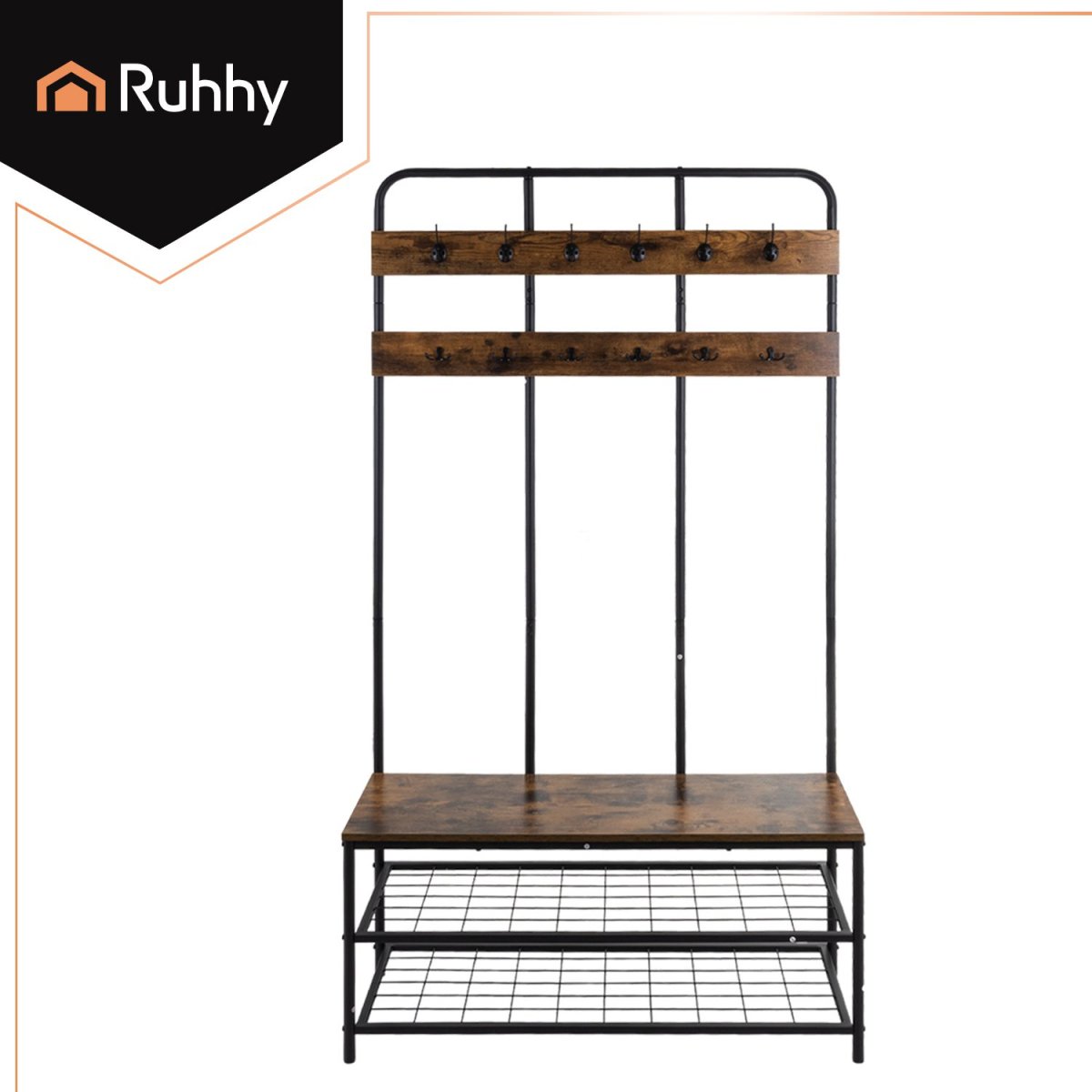 Elegant och praktisk hallhylla i metall och trä med skohyllor, sittbänk och starka krokar. Perfekt för ett organiserat och stilfullt hem.