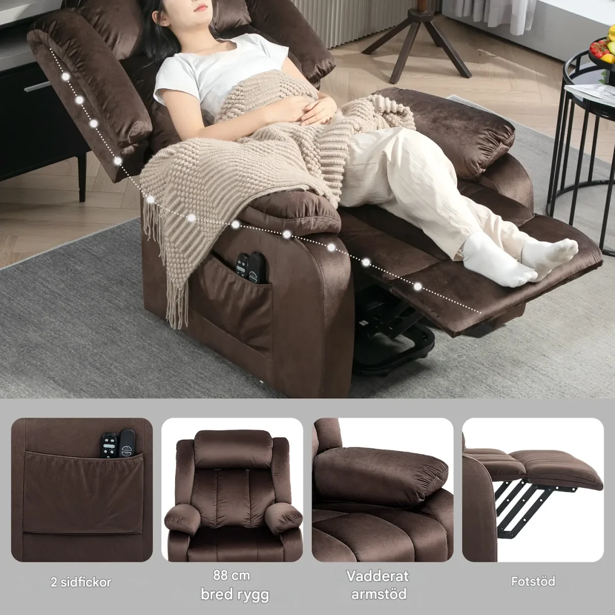 Elektrisk fåtölj med ståhjälp – idealisk för seniorer och rehabilitering Lutning upp till 150° med synkroniserat fotstöd 8 massagepunkter + värme i ländryggen med 5 program Klädd i mjuk brun sammet med tjock stoppning Inbyggda USB-portar för laddning (5V/2A) Enkel styrning med 2 fjärrkontroller Sidofickor för förvaring Max belastning: 135 kg
