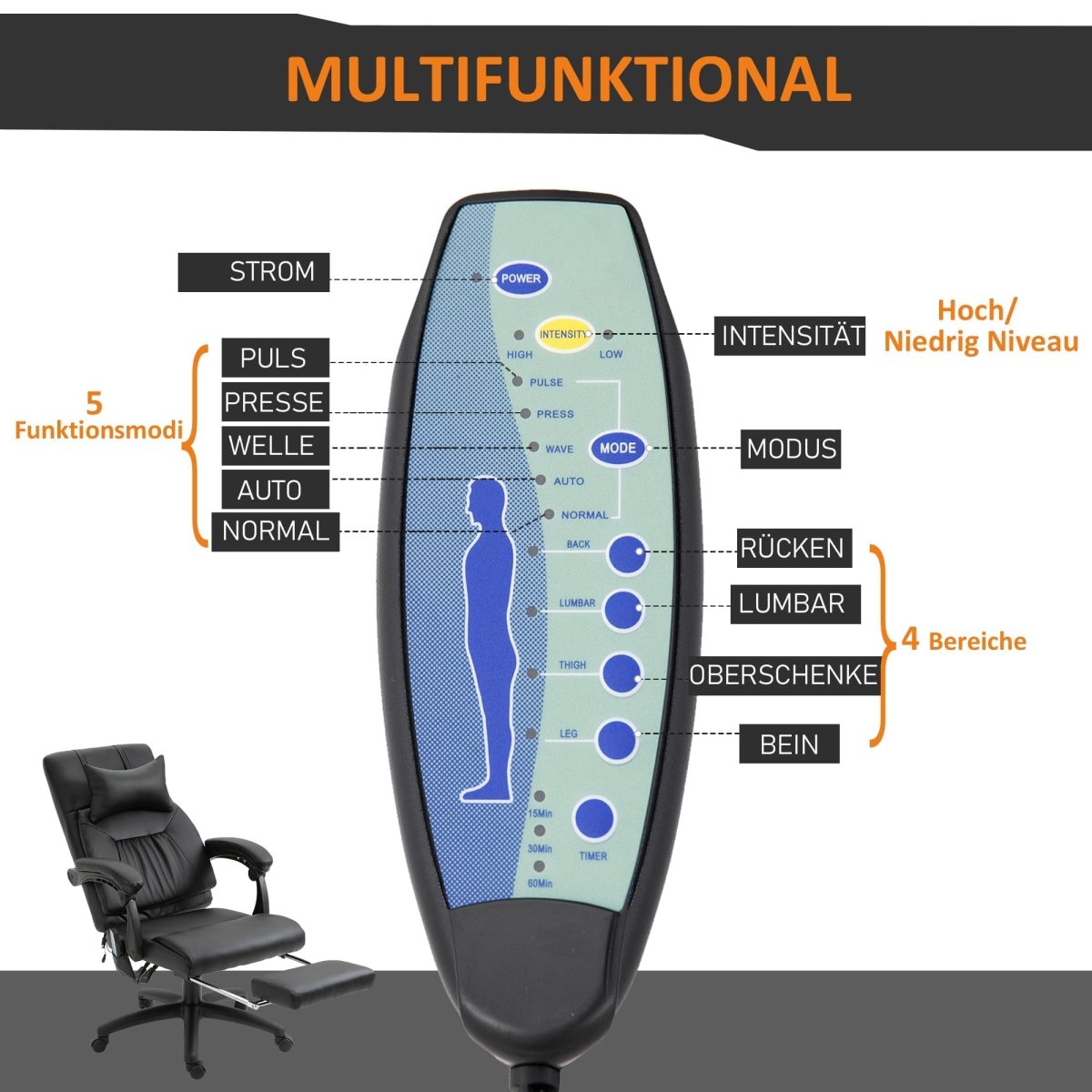 - Avancerad Massage: 7 vibrationspunkter och värme i ländryggen för djup avslappning.
