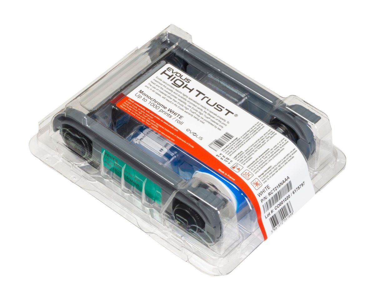 The Evolis RCT215NAAA white monochrome ribbon is great for printing white text and single-line art onto dark pre-printed cards. With 1,000 prints per roll, this ribbon works well for high-capacity printing in medium to large-sized organisations.