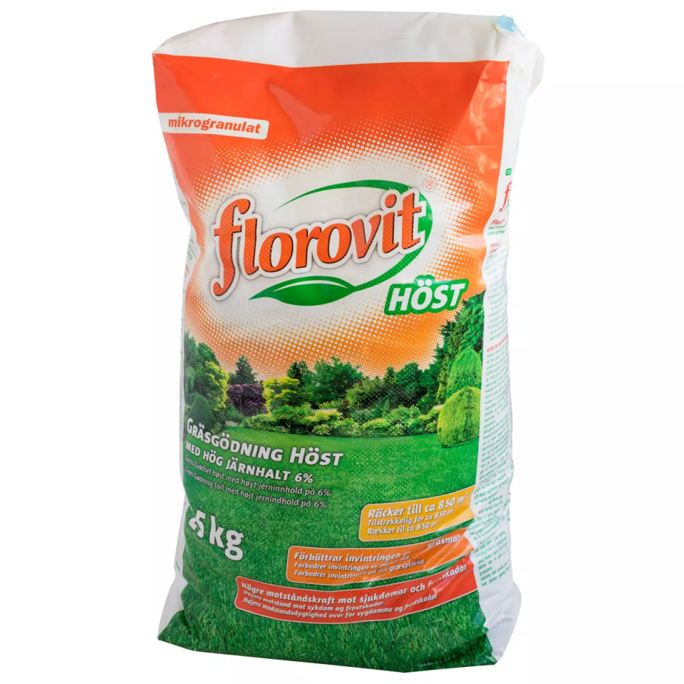 Florovit Gräsgödning Höst med hög järnhalt i 25 kg förpackning är komponerad för att ge gräset den näring det behöver under hösten och vintern. Gödning med låg halt av kväve ges på hösten för att gräset skall växa saktare, men förlänger även gräsets växtlighet och gör så att din gräsmatta behåller sin intensiva grönska långt fram på hösten. Med en högre halt av kalium och järn ökar man motståndskraften mot sjukdomar och bidrar till en bättre övervintring. Florovit Gräsgödning Höst ger din gräsmatta en intensiv grönska och förbättrar gräsmattans kondition.