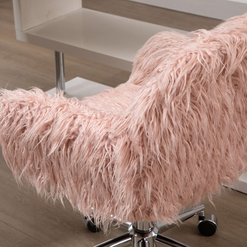 Den mjukt vadderade sitsen täckt i fuskpäls (100% akryl) ger en otrolig sittkomfort och avkoppling. Det ergonomiska ryggstödet och armstöden ger extra stöd, vilket gör stolen perfekt för långa arbetspass eller avslappnande stunder. Dess trendiga och lyxiga utseende gör att den smälter in i både moderna och klassiska inredningar.