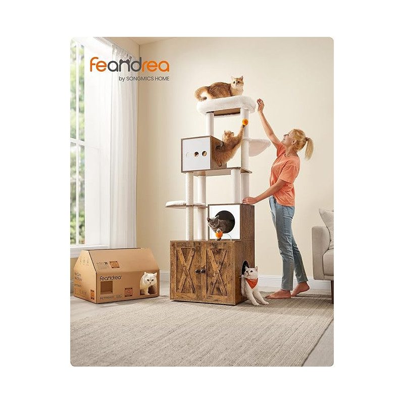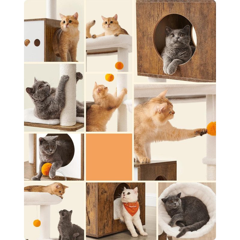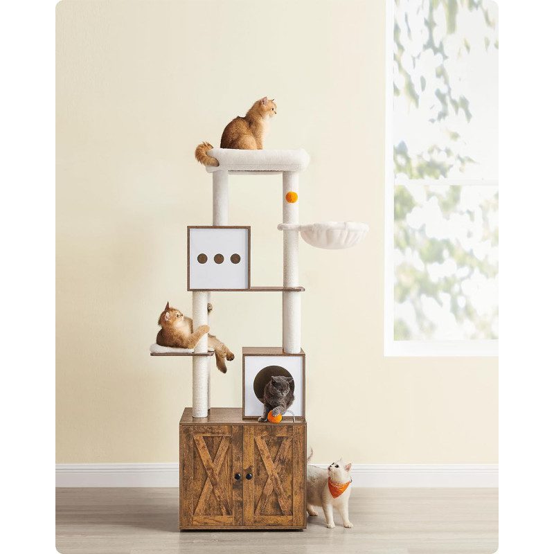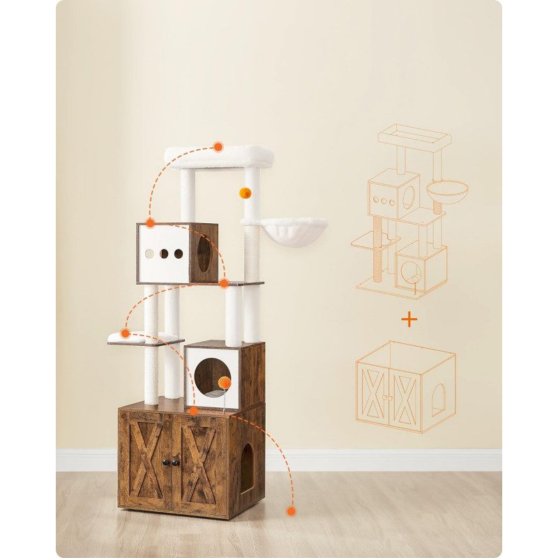 Platsbesparande 2-i-1-design som kombinerar klösträd och katthus/kattlåda för en smart helhetslösning i hemmet
