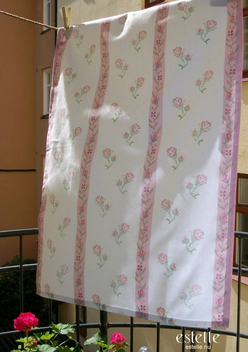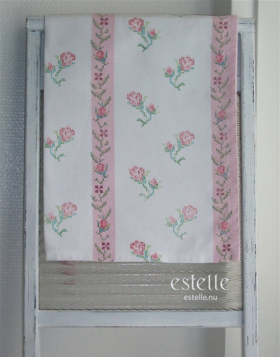 Kökshandduk i vitt och rosa med blommor i tryckta korsstygn. Hängband. 100% bomull.
