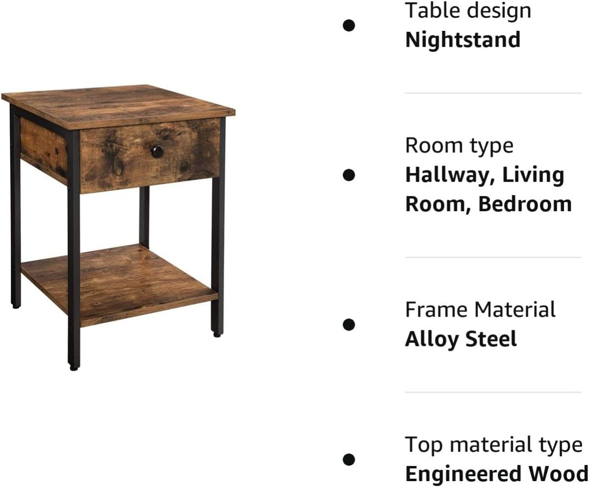 - Sidobord i rustik brun träfinish med svart metallram som ger en modern industriell känsla.