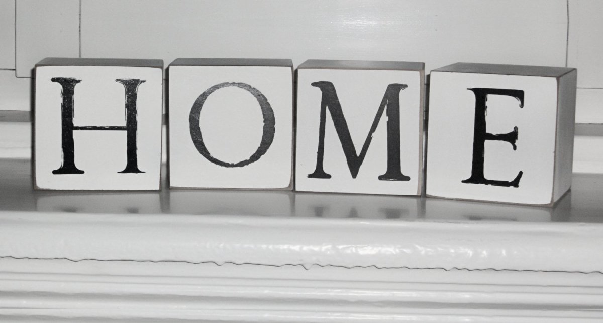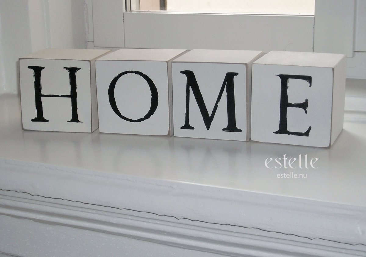 Vita fristående kuber i trä/mdf, 10 x 10 x 10 cm. Setet innehåller 4 kuber med en bokstav på varje som tillsammans bildar ordet “HOME”. Storlek: tillsammans är kuberna ca 40 x 10 cm.