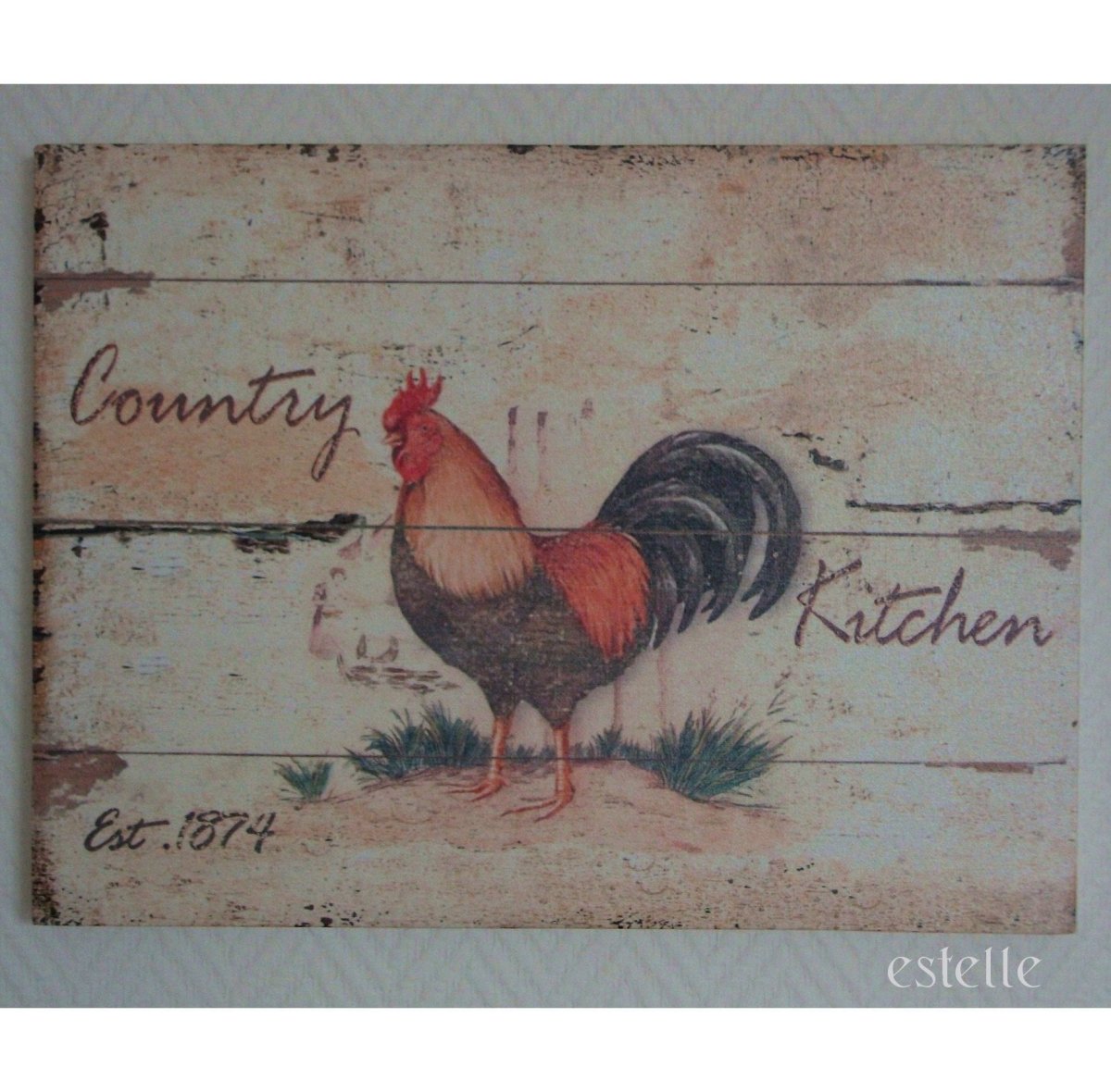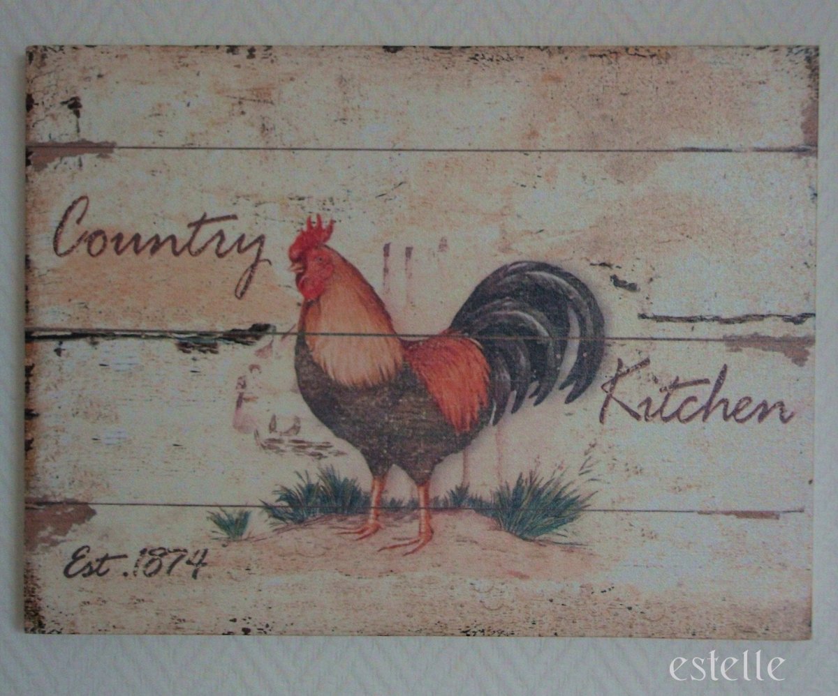 Lantlig canvastavla med tupp. Canvasduken är uppspänd på träram. Storlek: ca 30 x 40 cm. Träramens djup: ca 2,8 cm.