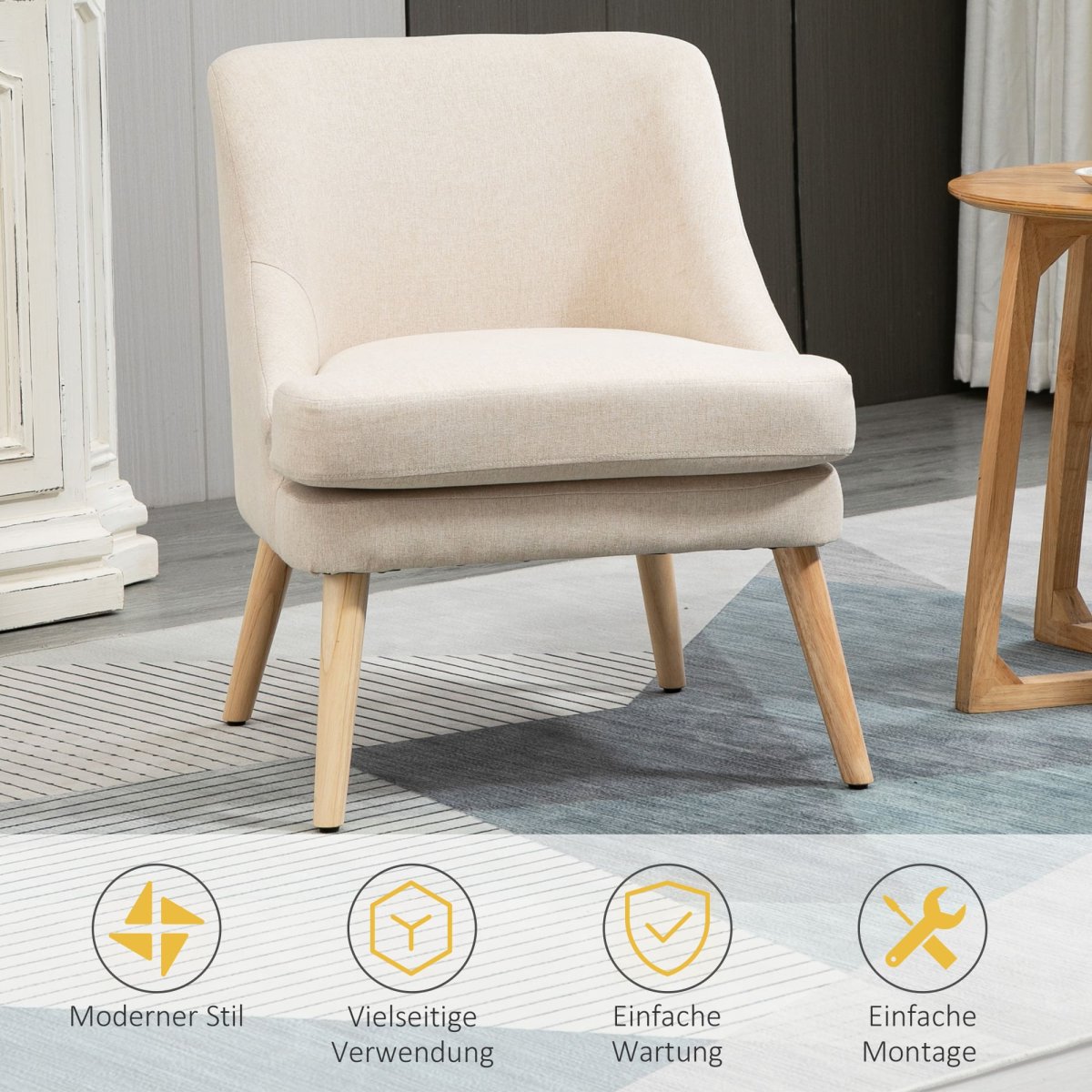 - Material: Linneliknande polyester, skum, gummiträ.
