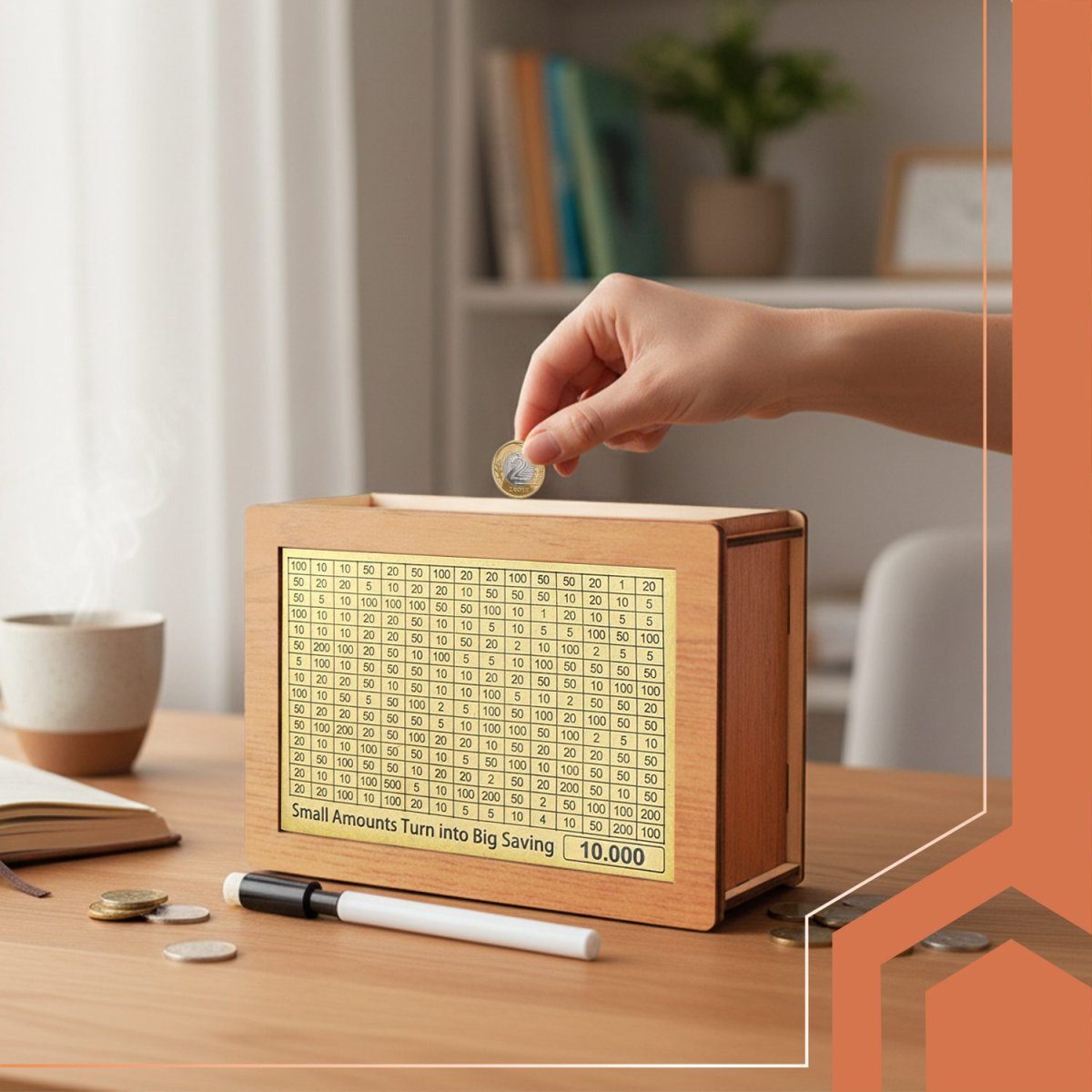 Skapa en rolig och inspirerande sparrutin med denna vackert designade sparlåda i naturligt trä. Perfekt för både barn och vuxna som vill nå sina ekonomiska mål på ett motiverande sätt.