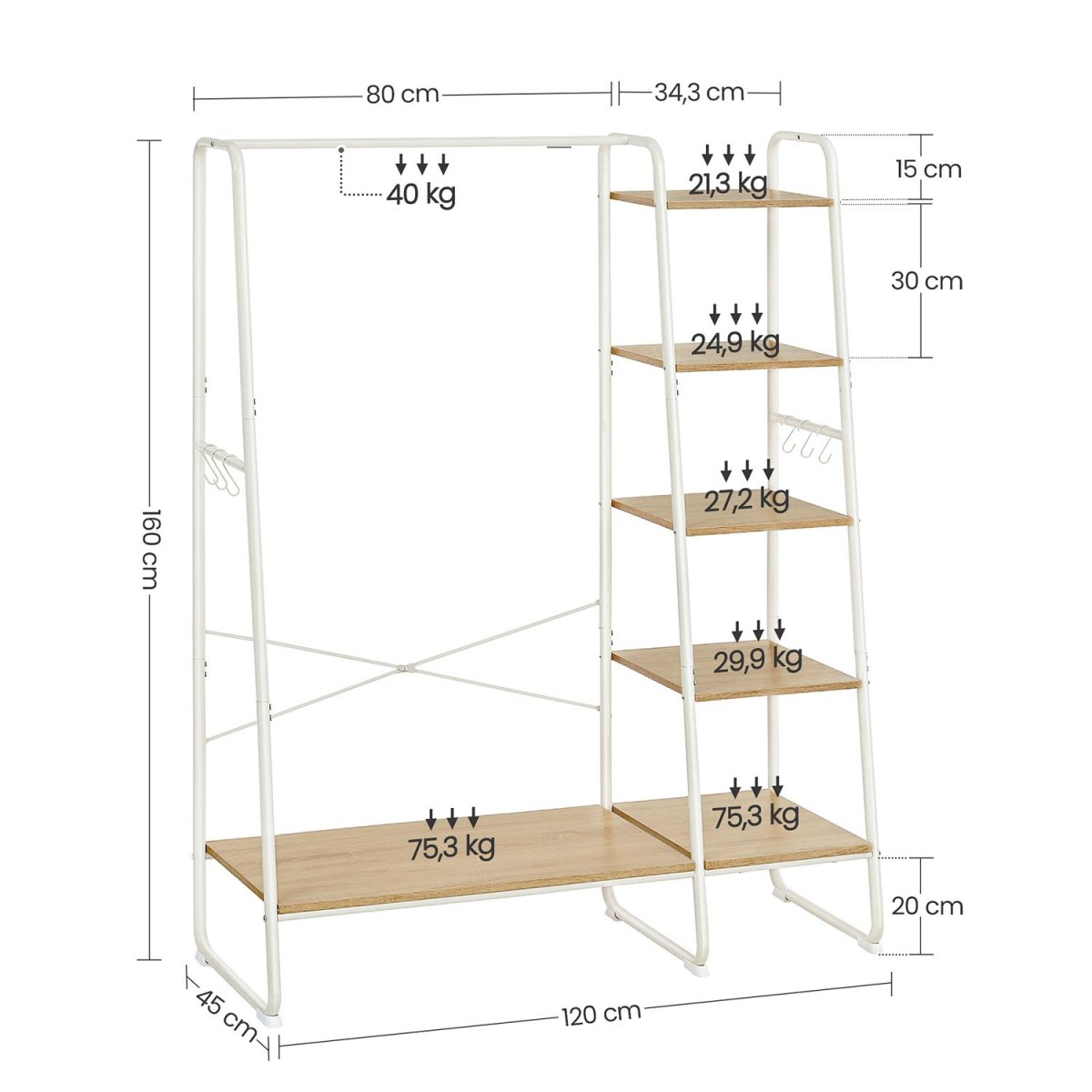 Produktbeskrivning Öppen garderob/klädställning i ek-vit med klädstång, hyllor, skoställ och 6 avtagbara krokar Generös storlek (45 × 120 × 160 cm) ger gott om plats för att hänga plagg, även längre rockar Öppen design håller kläderna synliga och lättåtkomliga – gör vardagen smidigare 6 hyllplan för organiserad förvaring av väskor, lådor, dekorationer eller andra tillbehör […]