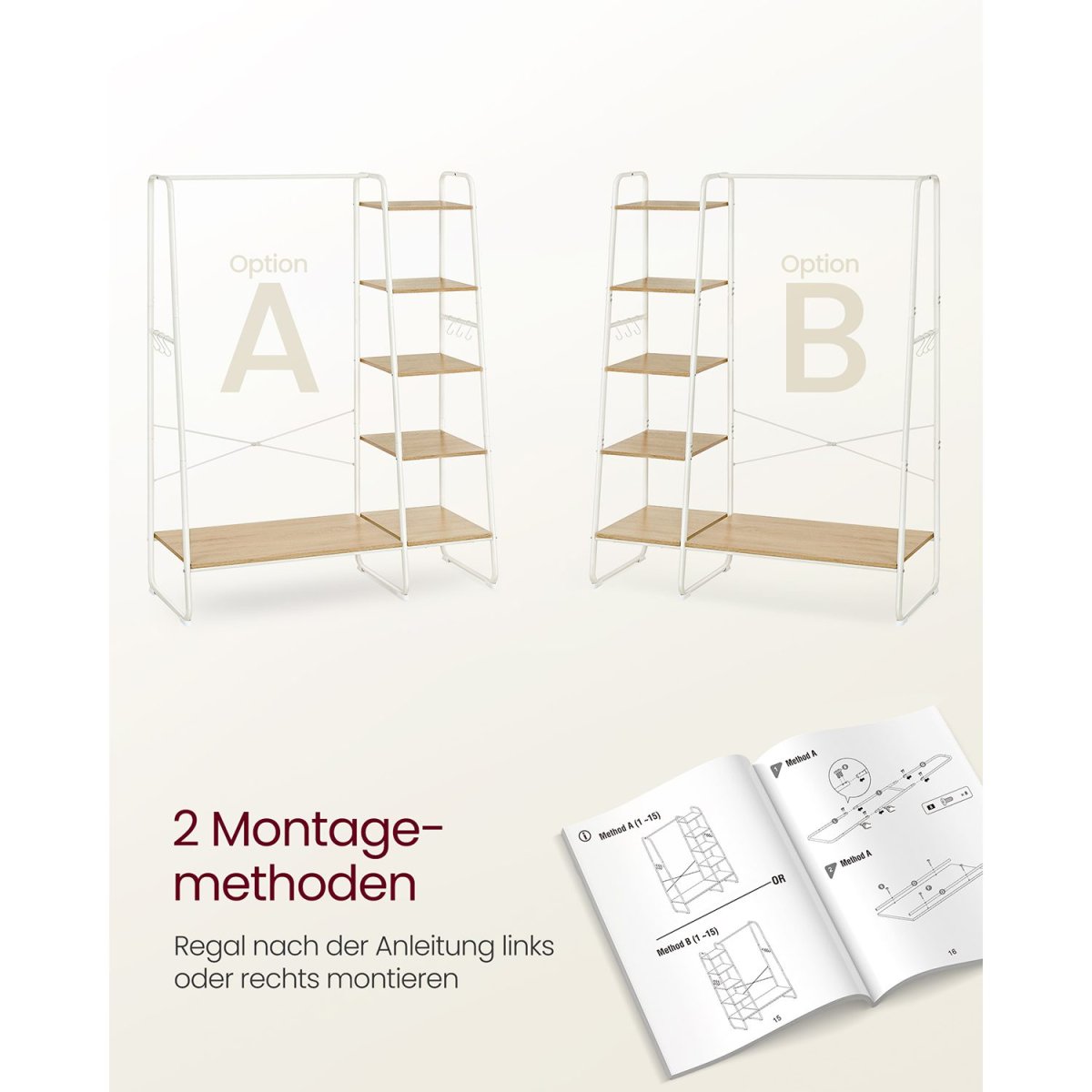 Öppen garderob/klädställning i ek-vit med klädstång, hyllor, skoställ och 6 avtagbara krokar