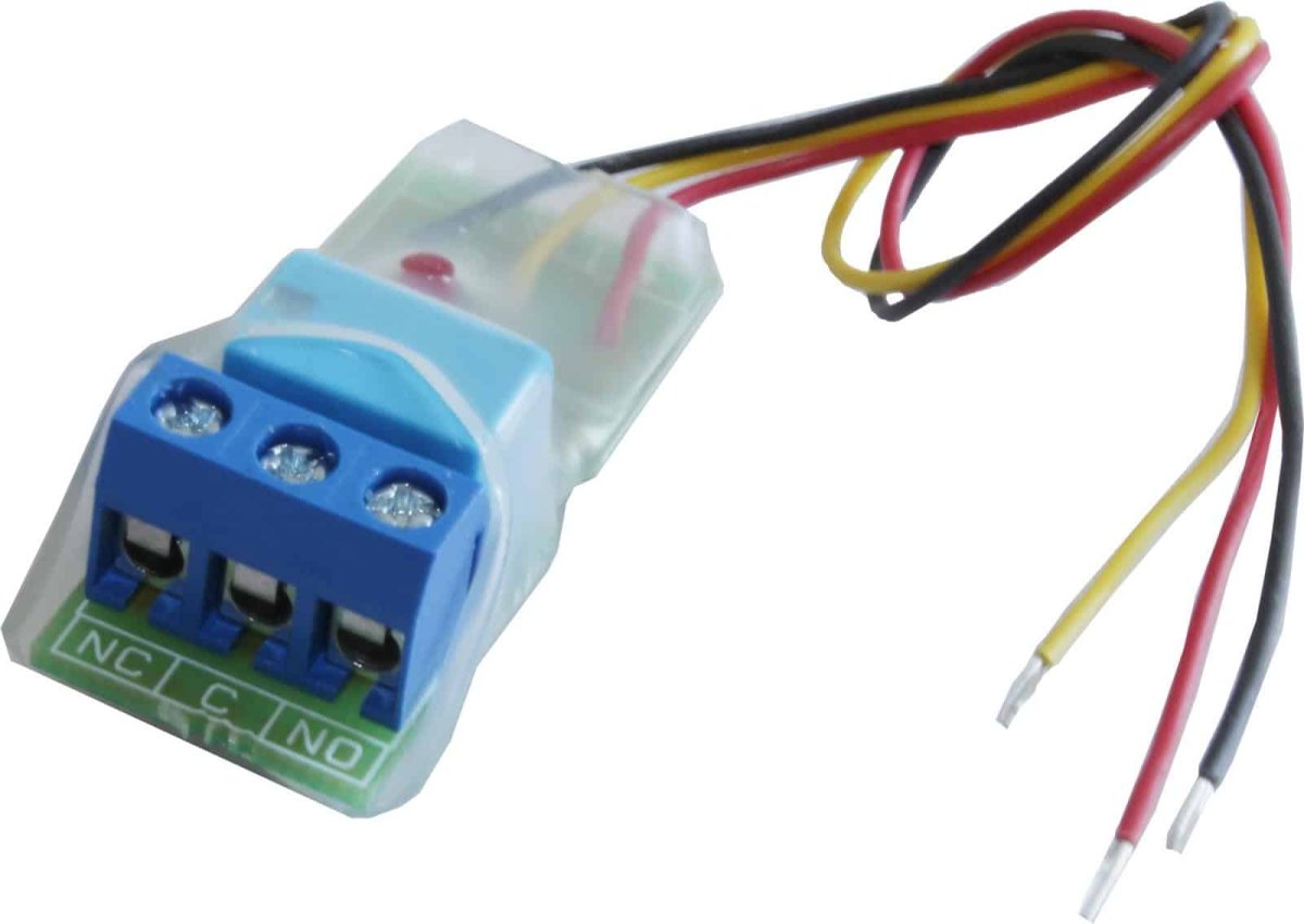 Ett mycket litet universellt reläkort med självhäftande kudde för enkel montering vart som helst. Inkoppling sker via skruvplint. Styrsignal och matning ansluts via 15cm kabel. Relät på 1A styrs via en transistor vilket gör att en mycket låg styrsignal krävs (1mA). Lysdiod indikerar när reläet aktiveras.