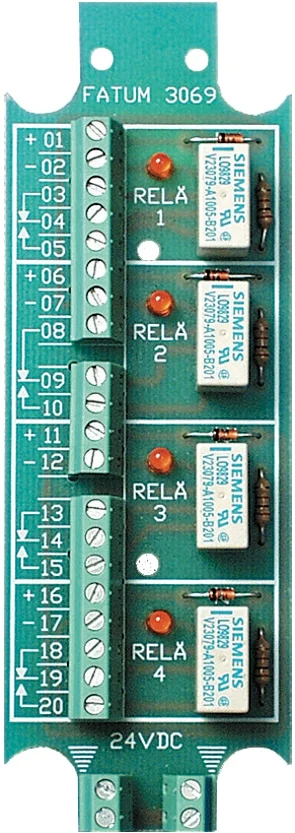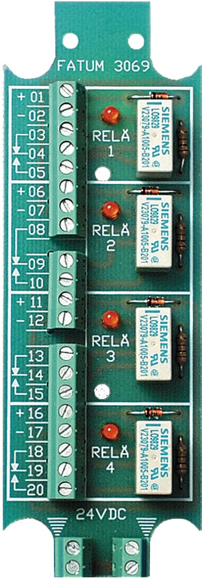 Reläplint med 2 st eller 4 st reläer. Lysdiod parallellt med spole. Skyddsdiod. 2 st resp. 1 st friliggande växlings-kontakter på vardera relä. Separat anslutningsplint för skärm.
