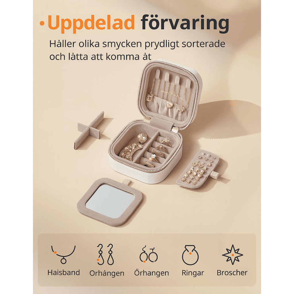 Res med stil och organisation. Det här lilla smyckeskrinet är perfekt för dig som vill hålla ordning på dina smycken — hemma eller på resa. Den kompakta storleken gör det enkelt att ta med, samtidigt som du får praktisk förvaring för ringar, halsband, armband och örhängen. Inuti har du flera fack där varje smycke får sin plats, och den inbyggda spegeln gör det smidigt att prova direkt — utan att behöva leta fram kompisens spegel i sista stund.