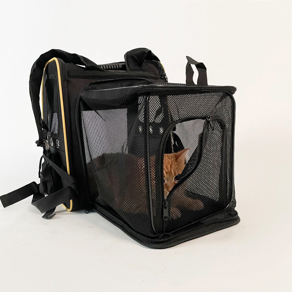 Ryggsäck för katt & hund – ventilerad modell med fickor, transparent front, 35×41,5×28 cm (max 7 kg), svart