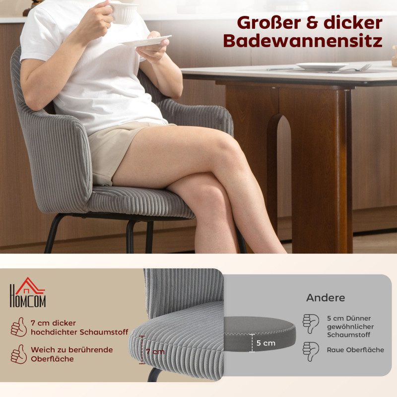 Mjuk ribbad cordklädsel med tjock skumstoppning Bred sits: 49 x 47 cm med 7 cm dämpning Ergonomiskt rygg- och armstöd för långvarig komfort Stålben med justerbara fötter för stabilitet Modernt, inbjudande wannen-design för flera rum Snabb och enkel montering