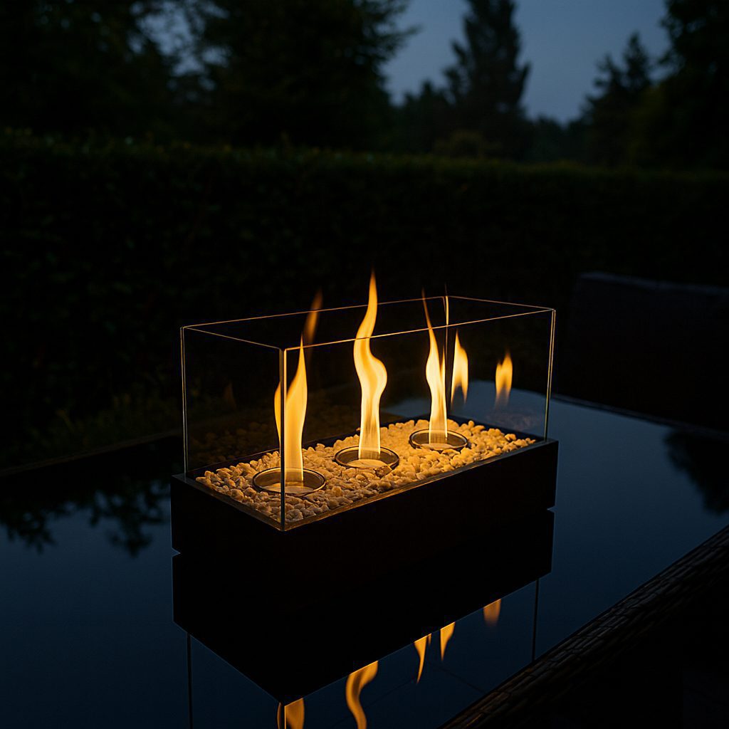 ✔ Fristående bioetanolkamin som passar hem, terrass och kontor – ger både värme och en mysig atmosfär