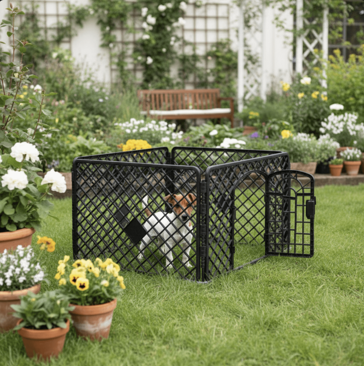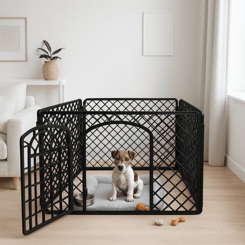 Ge din valp eller lilla hund en egen trygg plats. Den här valphagen på 90 × 90 × 60 cm skapar ett säkert område för lek, vila och träning – både inne och ute. Perfekt när du vill ha uppsikt, skydda hemmet från tuggande småtänder eller ge hunden en lugn hörna att dra sig tillbaka till.
