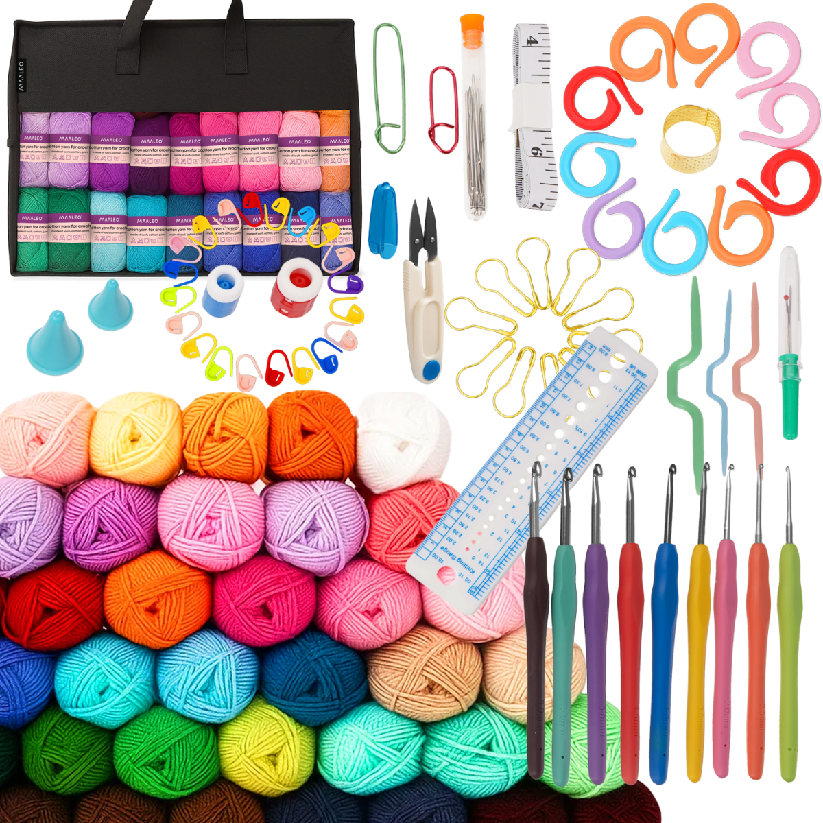 komplett virkningsset i xxl-format – 113 delar för både nybörjare och erfarna virkare 9 ergonomiska virknålar i storlekar 2,0–6,0 mm med tydlig storleksmärkning 40 garnnystan i olika färger – perfekt för både provlappar och mindre projekt många smarta tillbehör: säkerhetsnålar, maskmarkörer, måttband, sax, nålar med mera rymlig förvaringsväska med handtag och fack – lätt att hålla ordning och ta med på resan idealisk present till den som älskar handarbete eller vill börja virka på riktigt