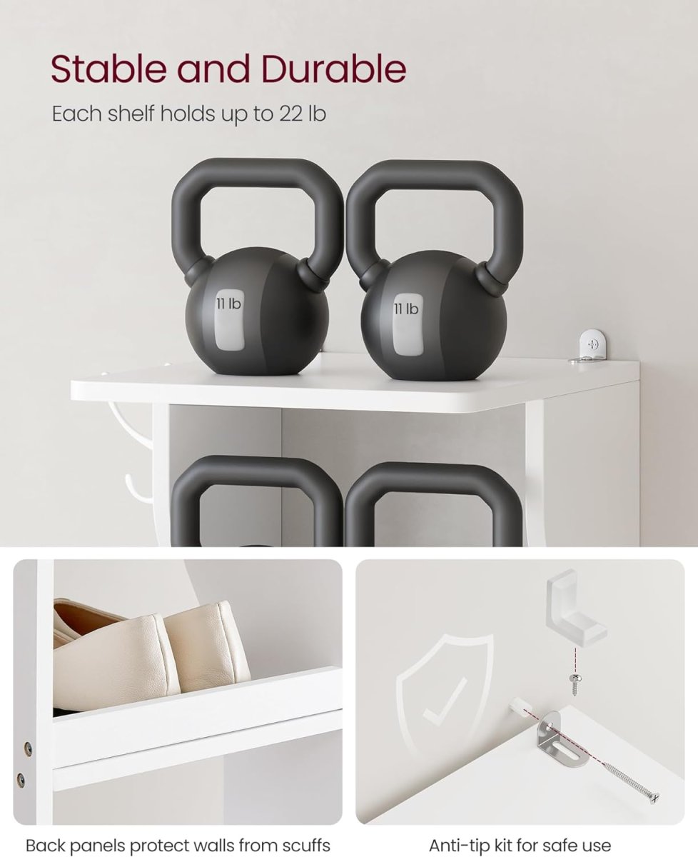Vit skohylla i trä med 7 nivåer, 2 krokar, 30 × 26,4 × 110,4 cm