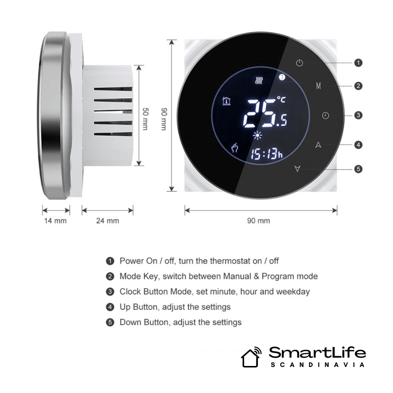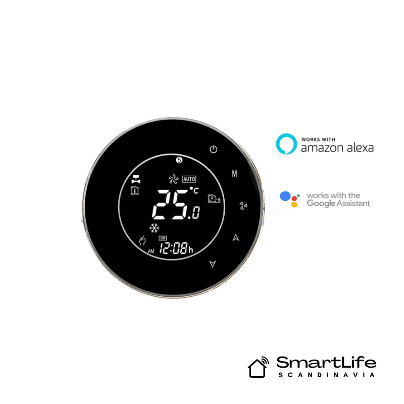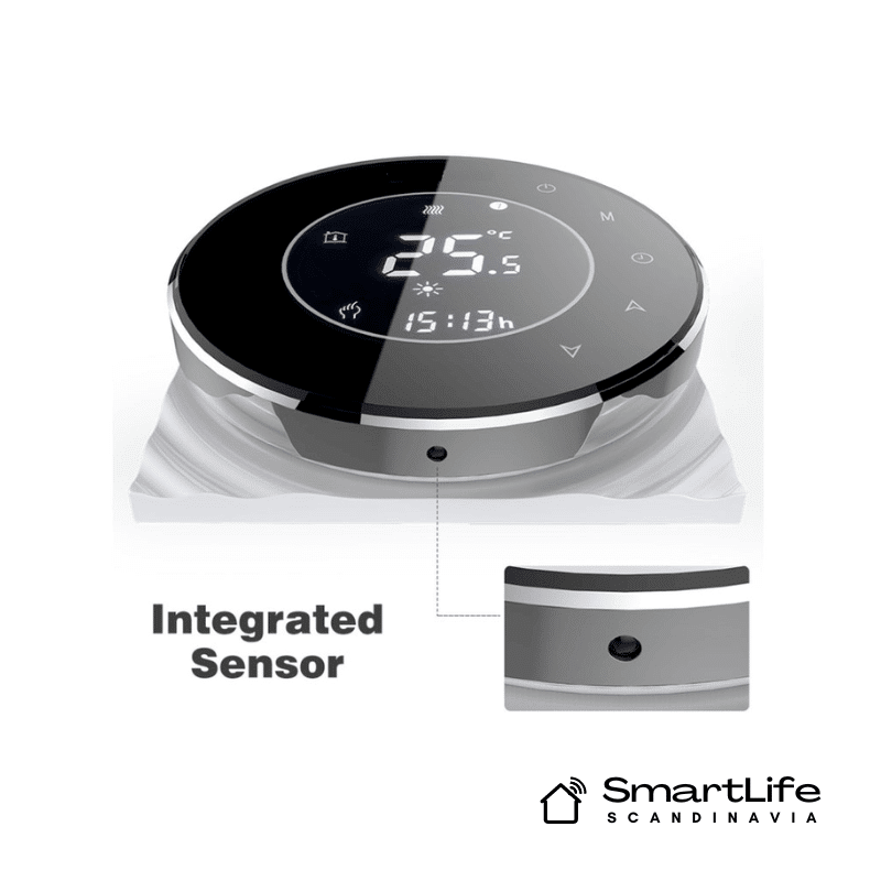 Styr temperaturen i huset med denna eleganta termostat i tre olika varianter som passar de flesta värmesystem. Du kan styra den direkt på den vackra touchdisplayen eller via din mobil, oavsett vart du befinner dig. Termostaten kopplas snabbt upp till ditt WiFi som ger dig full åtkomst i Smart Life appen för manuell eller schemalagd styrning.
